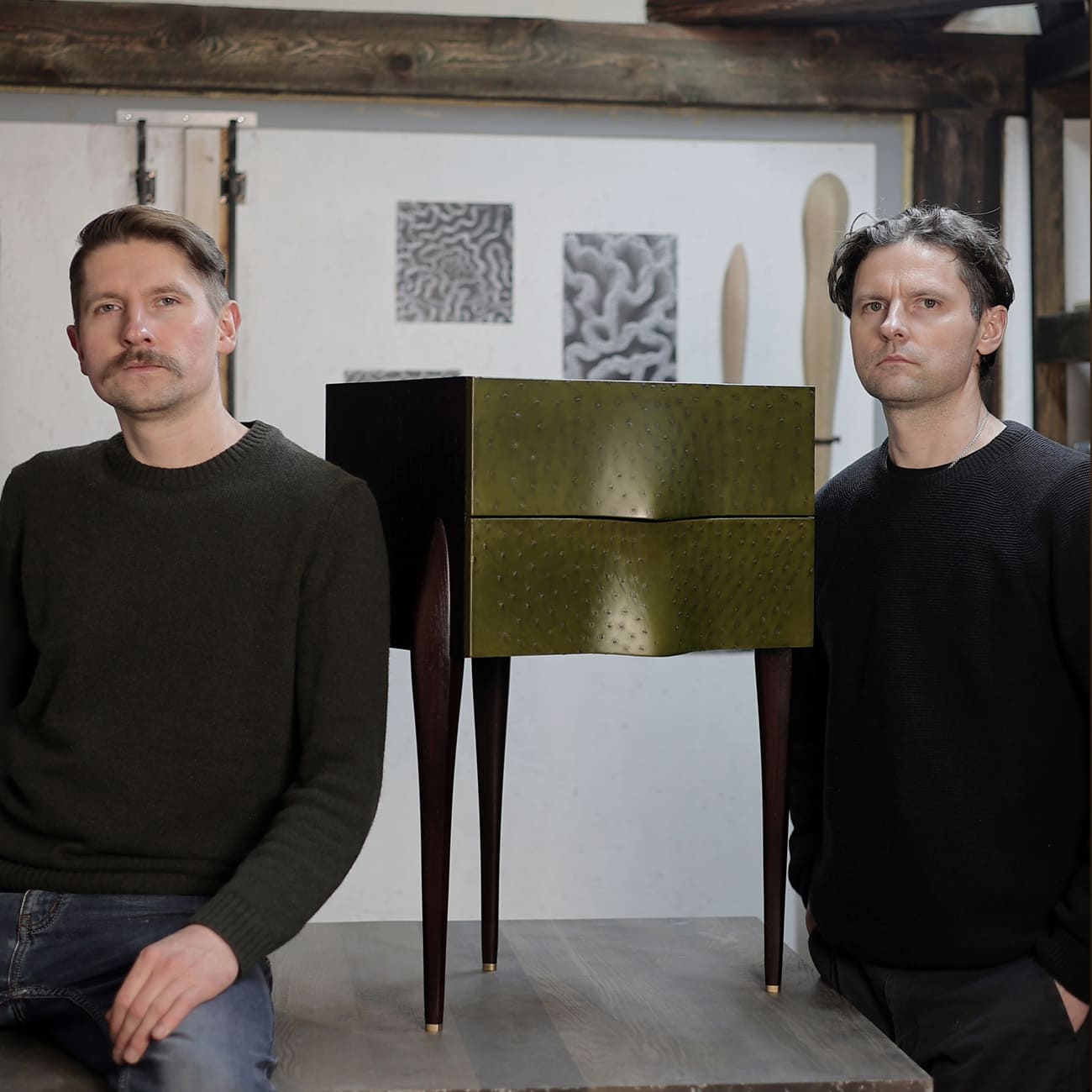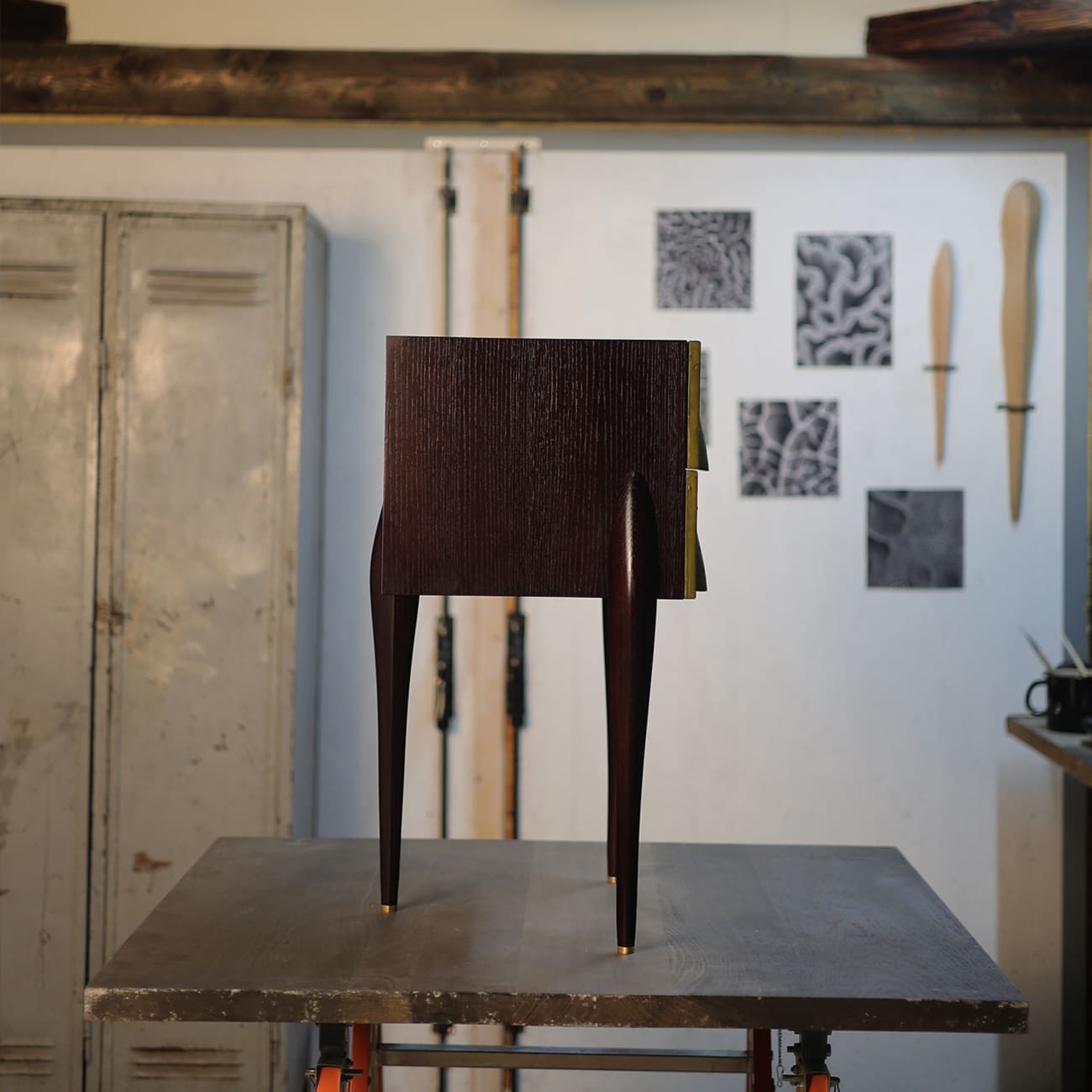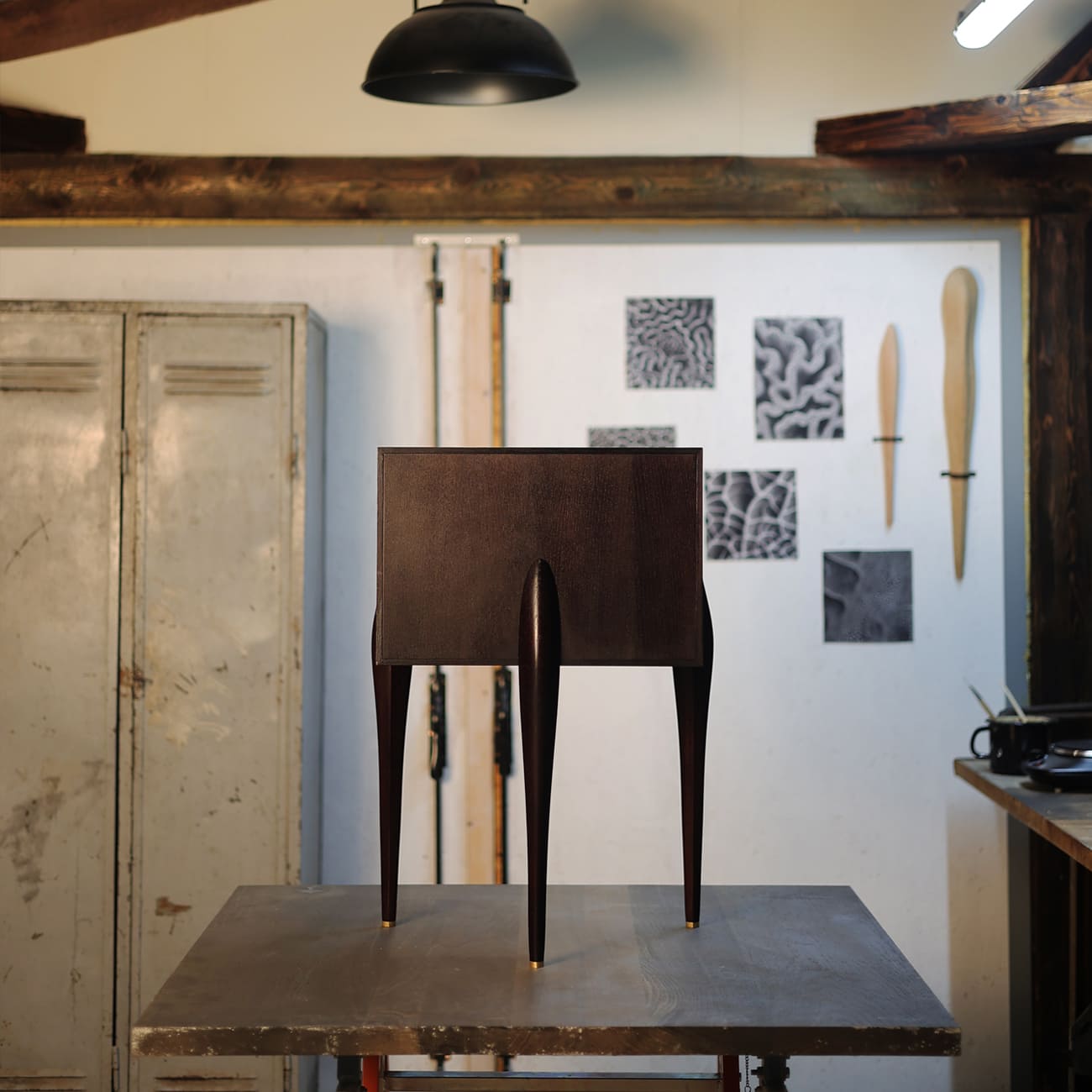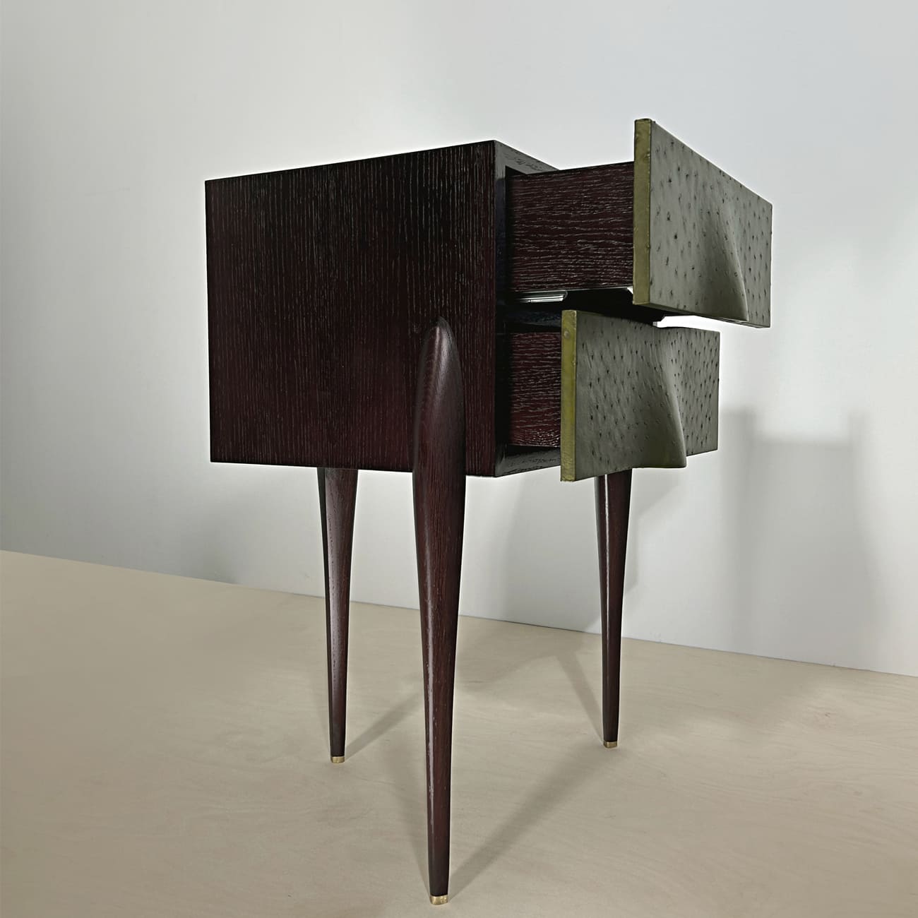 Szafka nocna Ostria Olive, dąb i pergamin strusi, proj. M. Palucki, Francja, 2024.