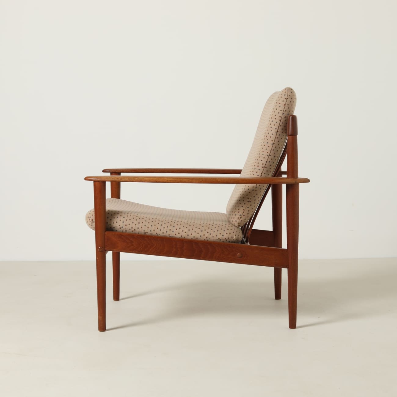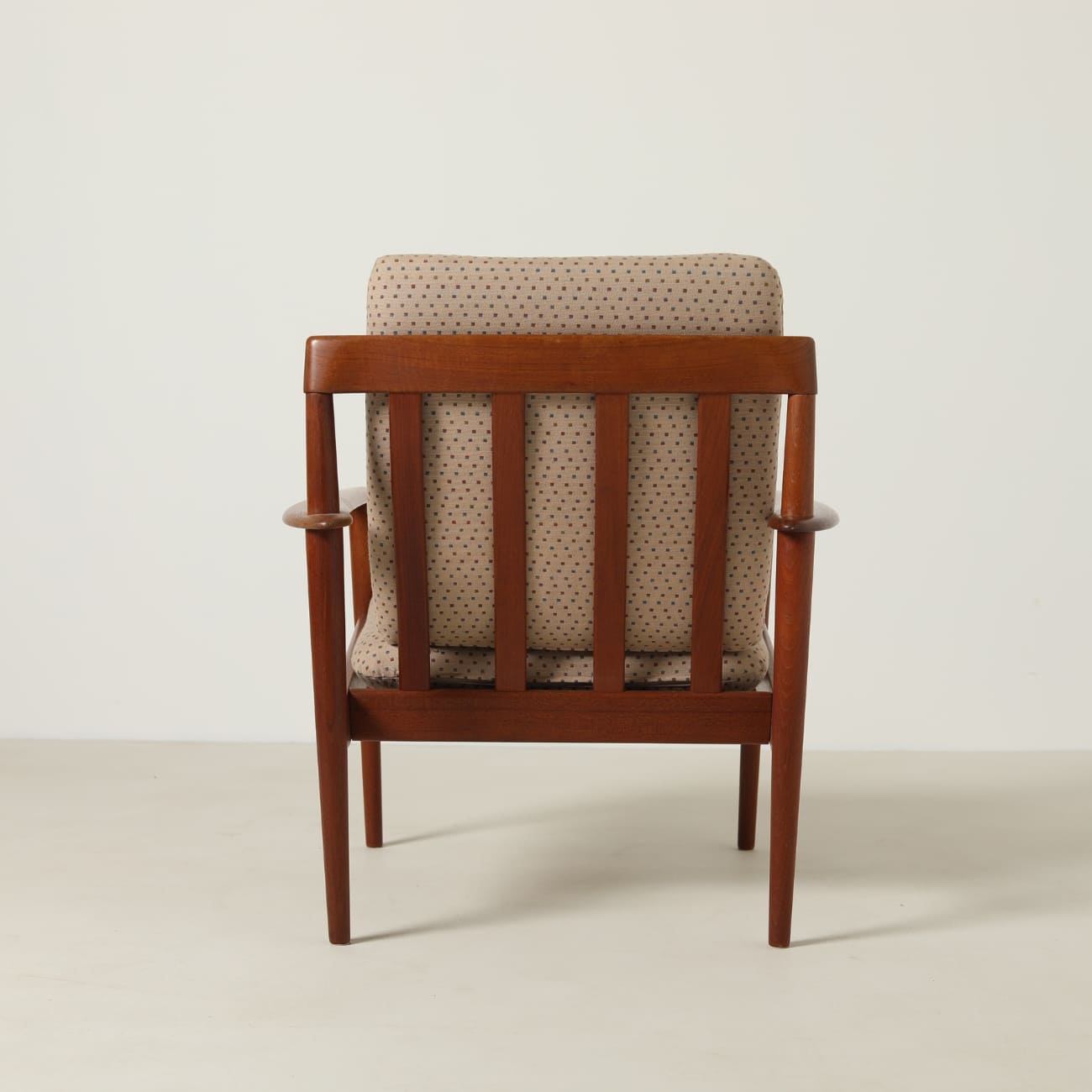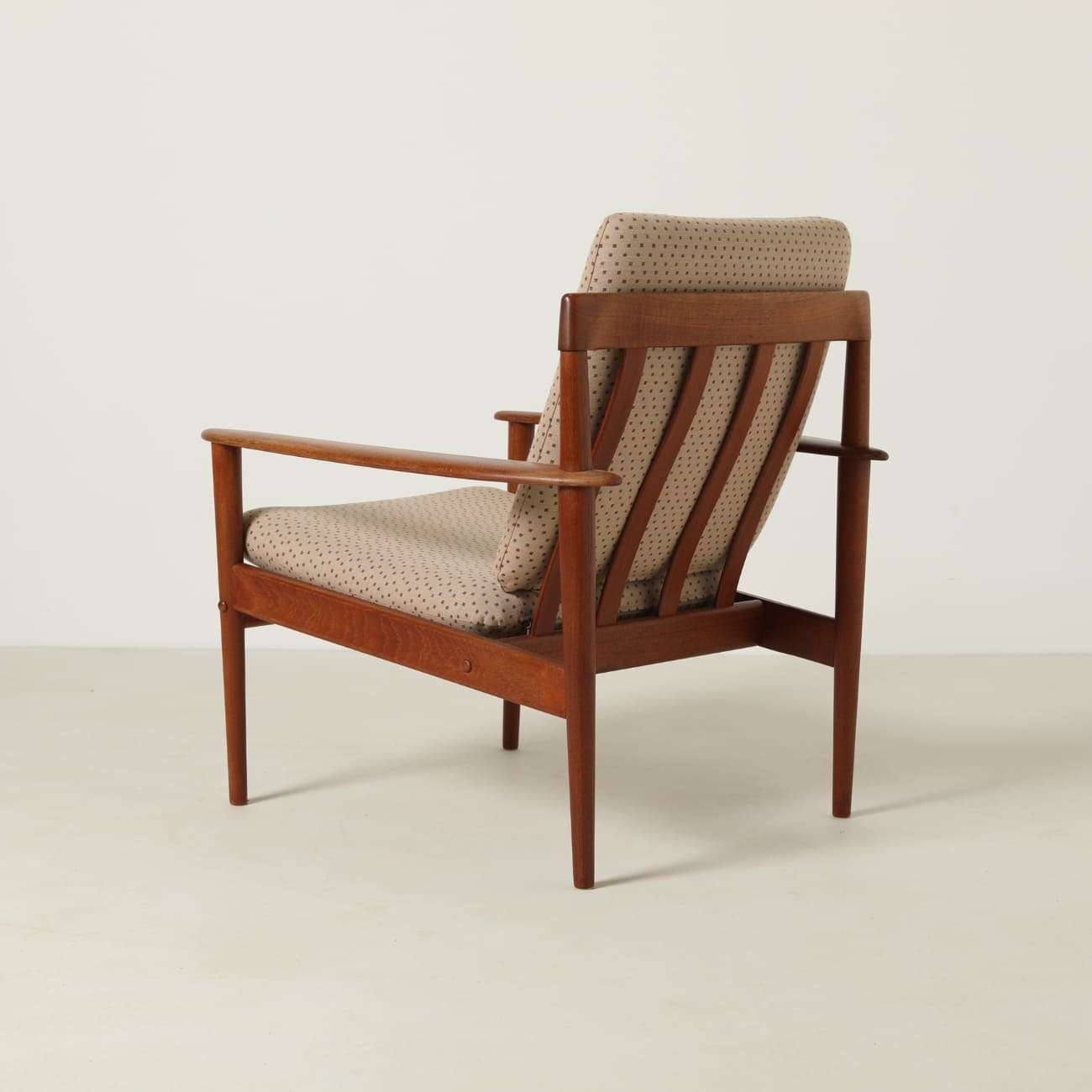 Zastosowanie teku wynika z jego właściwości i miejsca w duńskim designie tego okresu. Materiał ten zapewnia trwałość oraz stabilność konstrukcji, a jednocześnie pozwala na precyzyjne opracowanie detalu. Wełniane poduszki w beżowym, wzorzystym obiciu wprowadzają kontrast i podkreślają miękkość formy.