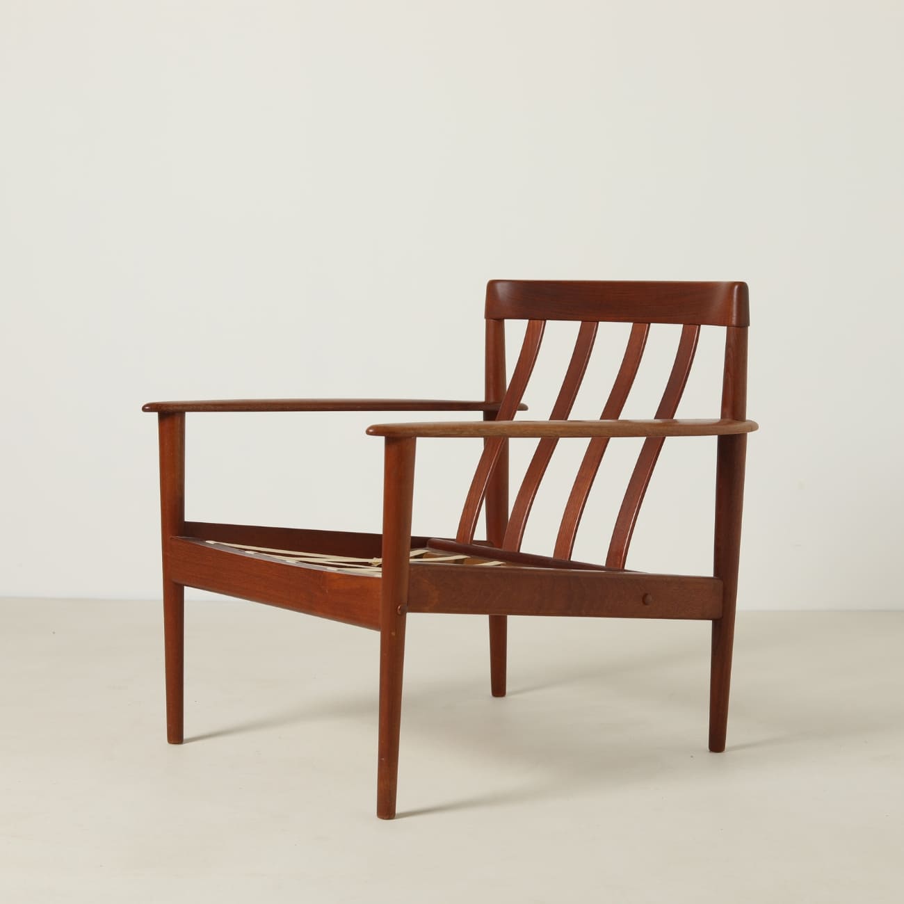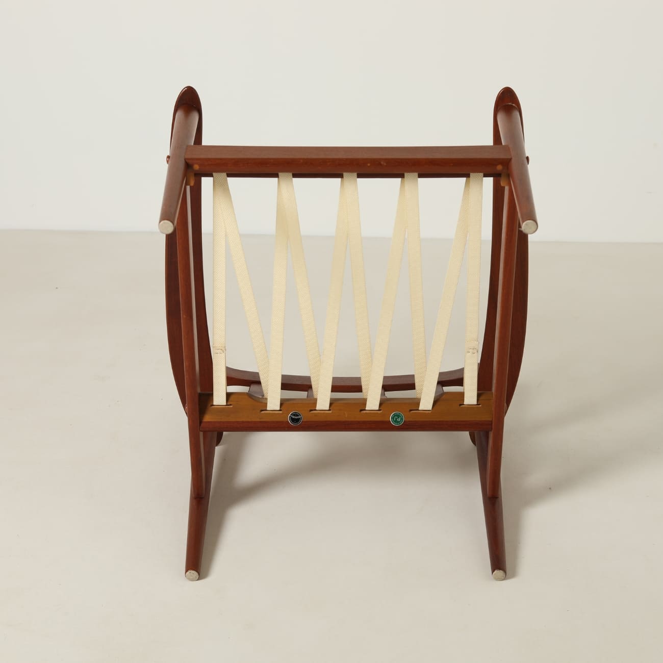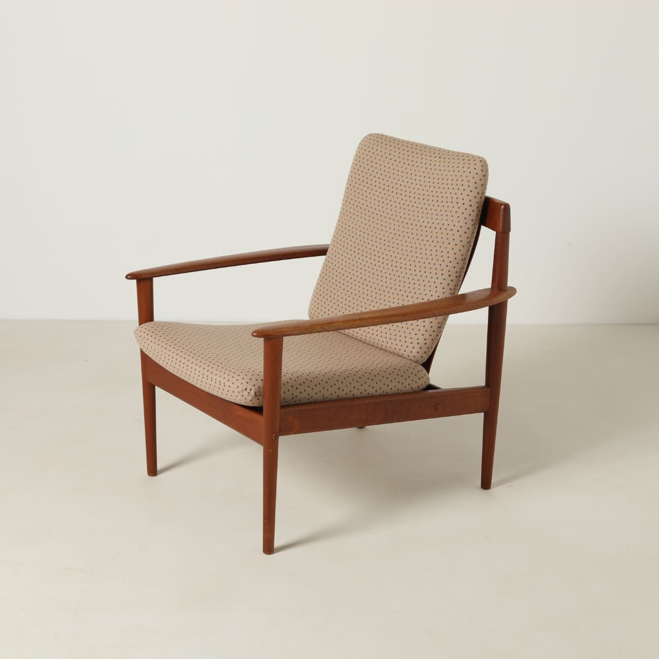 Zastosowanie teku wynika z jego właściwości i miejsca w duńskim designie tego okresu. Materiał ten zapewnia trwałość oraz stabilność konstrukcji, a jednocześnie pozwala na precyzyjne opracowanie detalu. Wełniane poduszki w beżowym, wzorzystym obiciu wprowadzają kontrast i podkreślają miękkość formy.