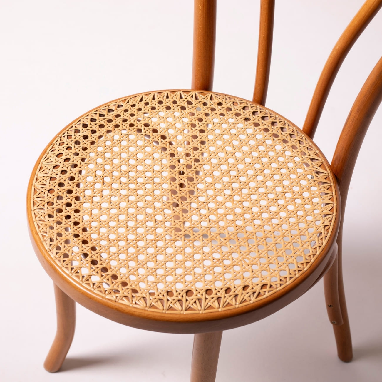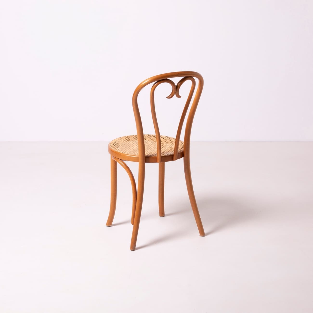 Zestaw czterech krzeseł z giętego drewna bukowego i ręcznie plecionej trzciny, wyprodukowanych w dawnej fabryce Thonet w Radomsku, około lat 80. XX wieku. Model nawiązuje do klasycznego „krzesła w kształcie serca”, popularnego w katalogach Thoneta oraz Radomska, kontynuującego tradycję wiedeńskich mebli giętych z przełomu XIX i XX wieku.