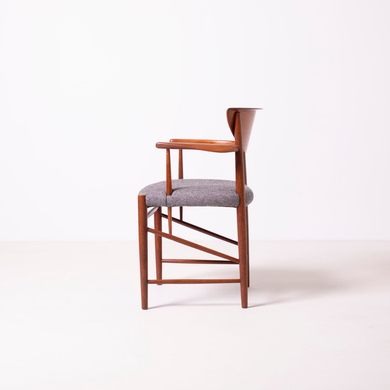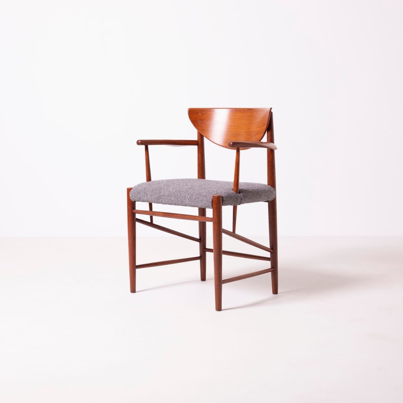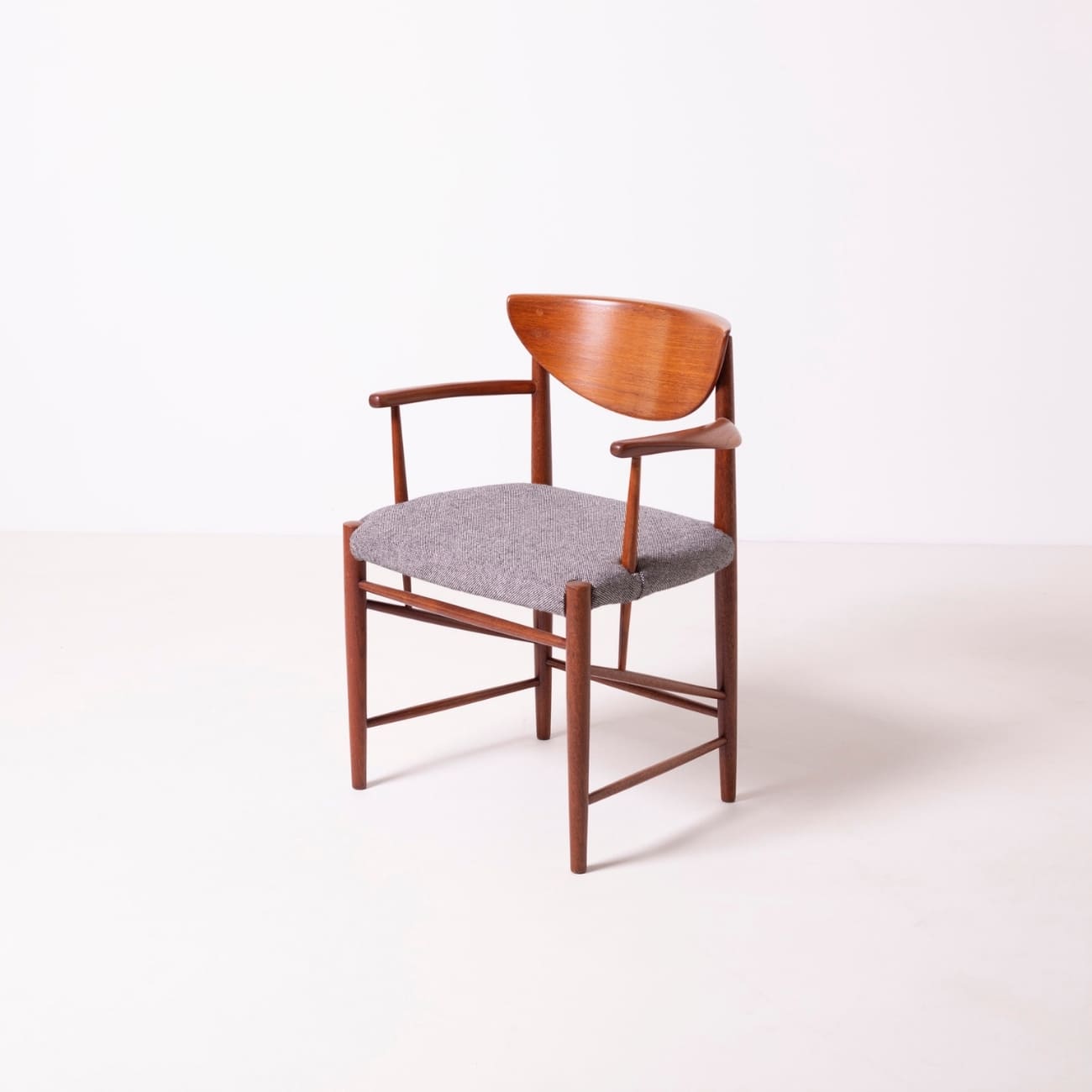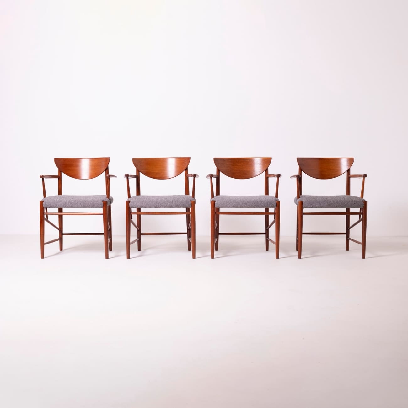 Wyrafinowany komplet czterech foteli zaprojektowanych przez duński duet Peter Hvidt i Orla Mølgaard-Nielsen dla wytwórni Søborg Møbelfabrik w latach 50. XX wieku. Charakterystyczna dla duńskiego modernizmu prostota formy spotyka się tu z mistrzostwem stolarskiego rzemiosła — lekkie, organiczne linie ram z litego drewna tekowego łączą elegancję z funkcjonalnością.