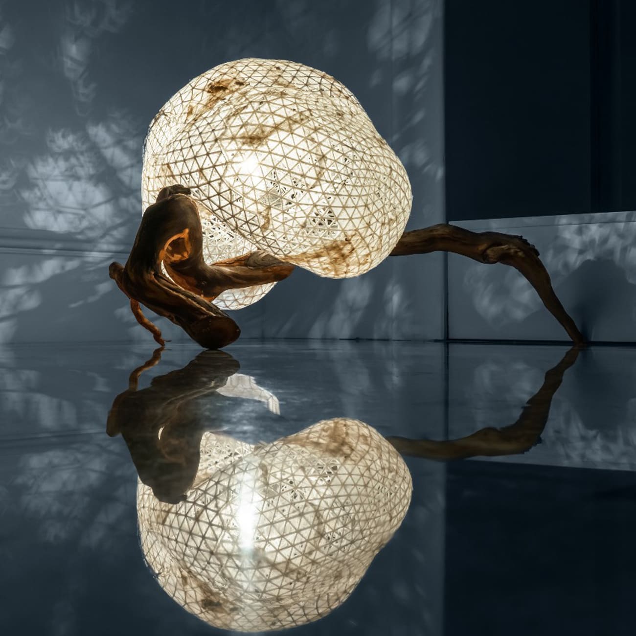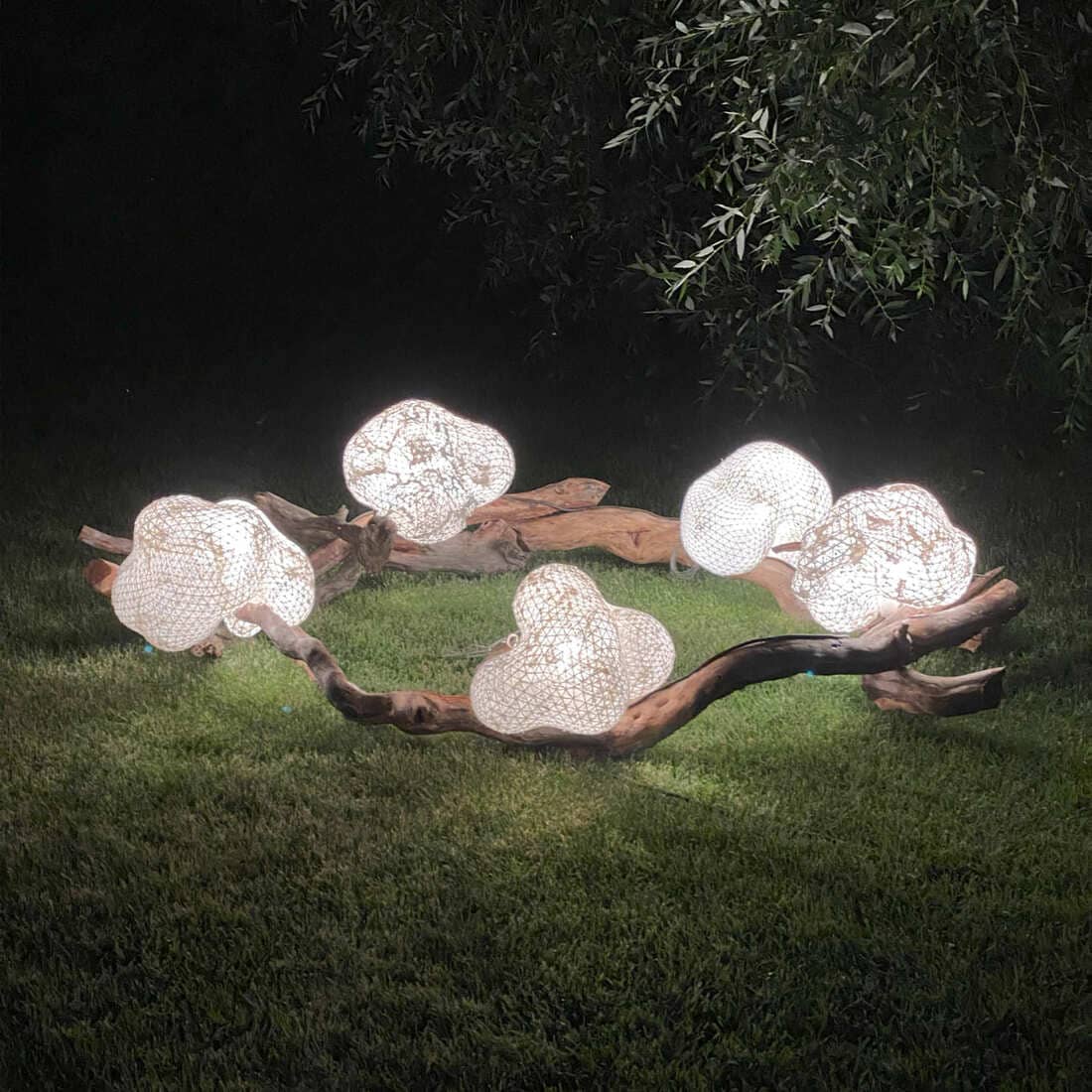 Artysta traktuje światło nie jako efekt dekoracyjny, lecz jako czynnik regenerujący – pierwiastek, który przywraca materii znaczenie i obecność. Roots + Clouds to refleksja nad cyklem życia i przemianą materii w energię; nad tym, jak natura może stać się współautorem nowego języka formy.