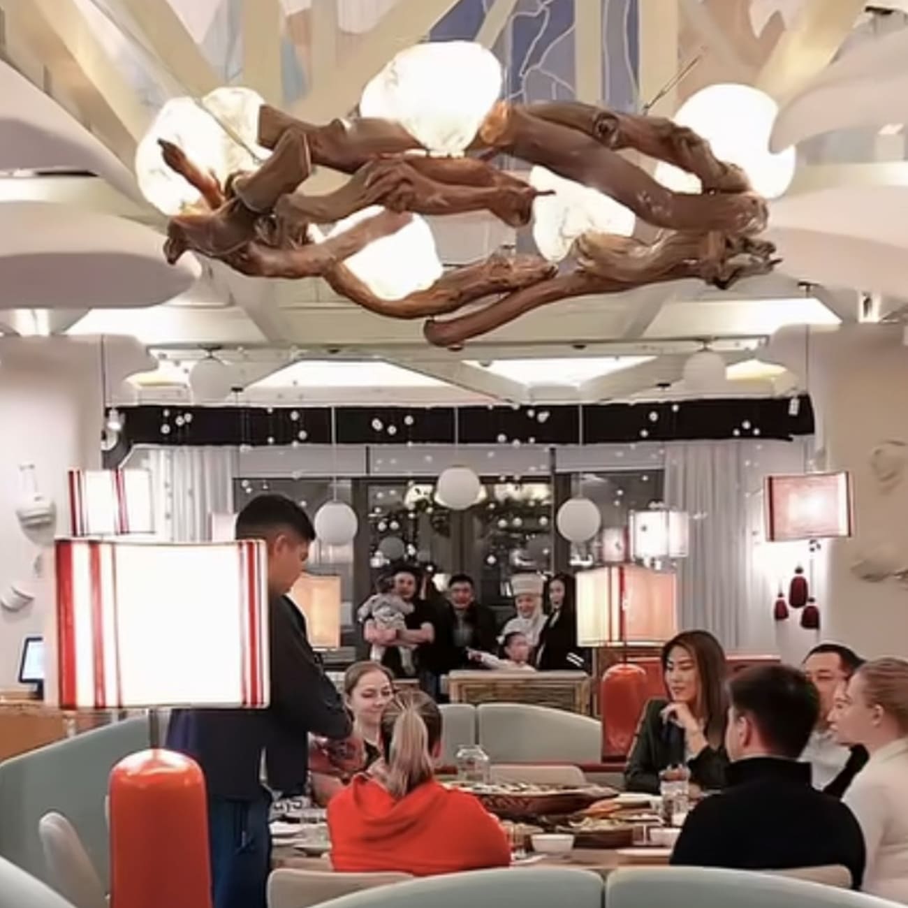 Roots + Clouds to rzeźbiarski żyrandol powstały w Kazachstanie, w którym naturalna materia staje się nośnikiem symbolicznej opowieści o czasie, pamięci i świetle. Konstrukcja została zbudowana z konarów sosnowych znalezionych na brzegach jeziora Burabaj – drewna, które przez ponad dwie dekady było kształtowane przez wodę i wiatr. Każdy fragment zachowuje ślad erozji, stanowiąc rusztowanie dla siedmiu świetlnych modułów z mlecznego, ręcznie dmuchanego szkła o porowatej, chmurowej fakturze. Ich delikatna luminancja przywołuje miękkie światło mgły, tworząc aurę zawieszoną pomiędzy naturą a technologią.