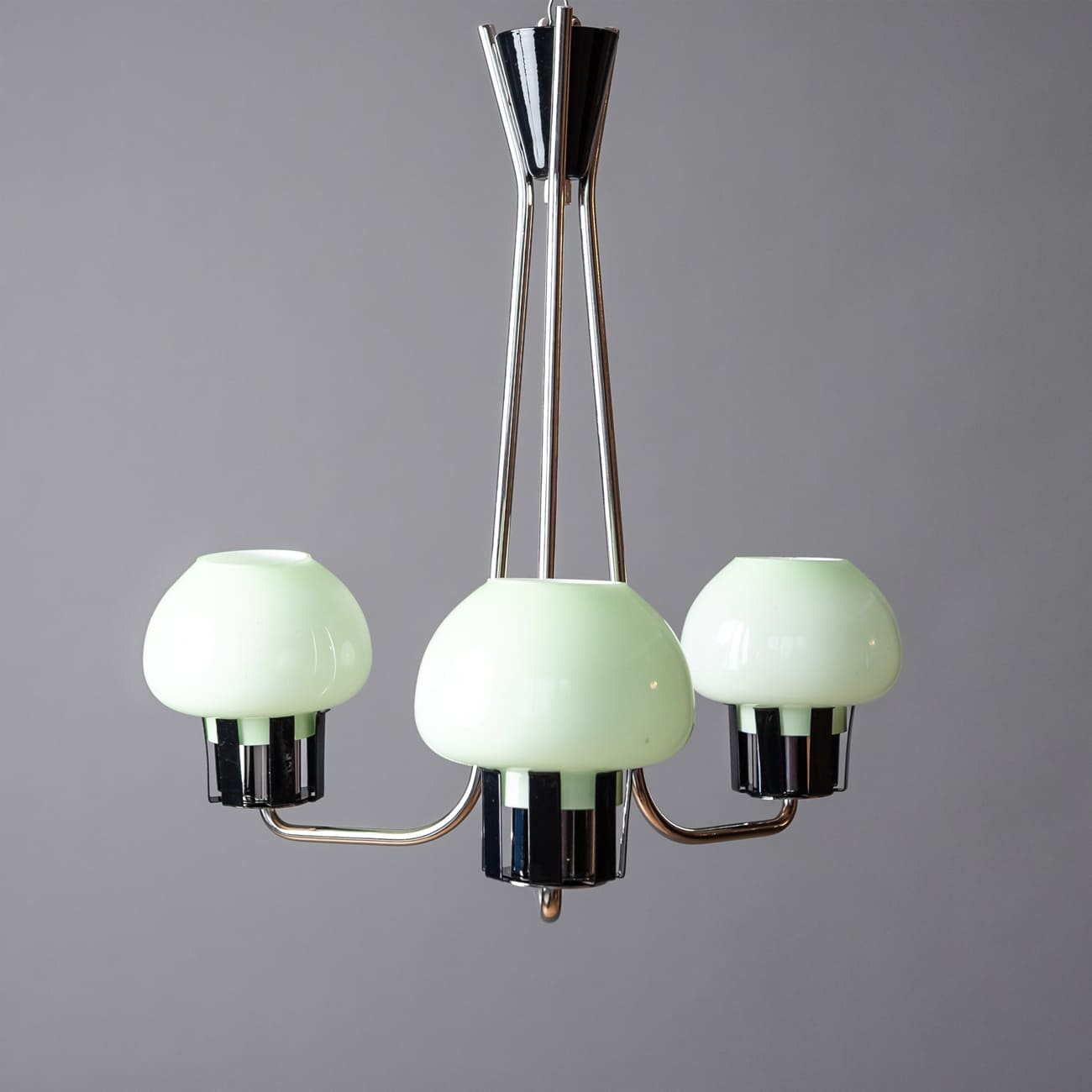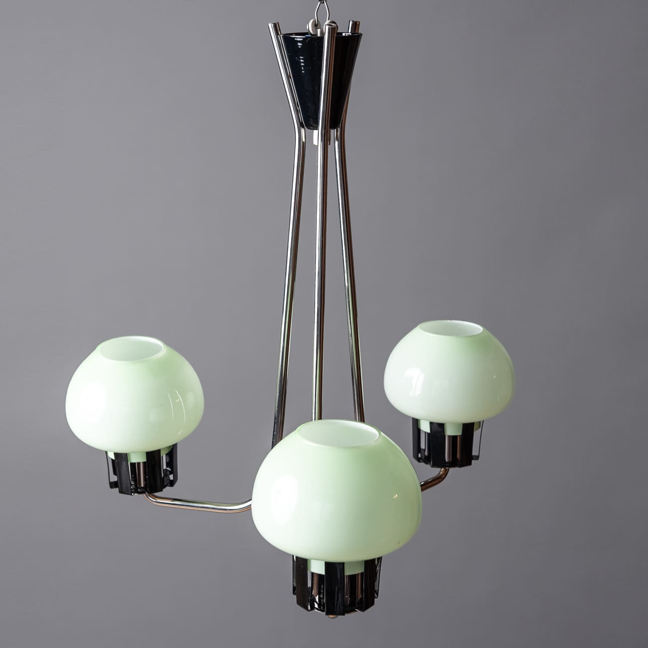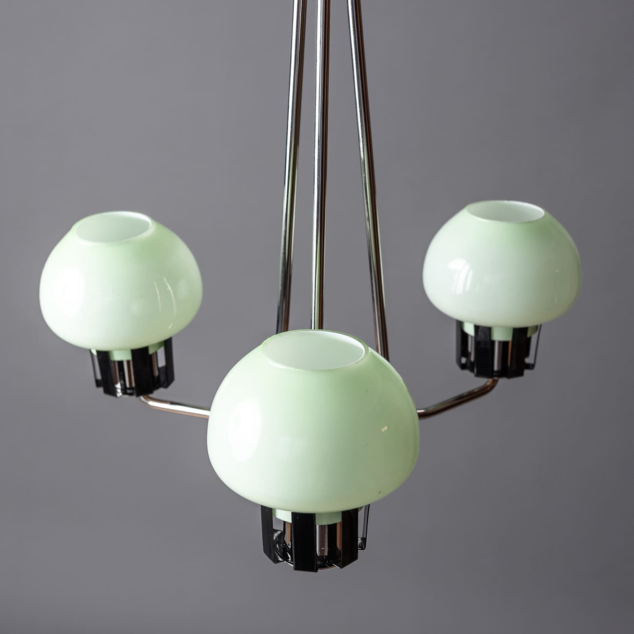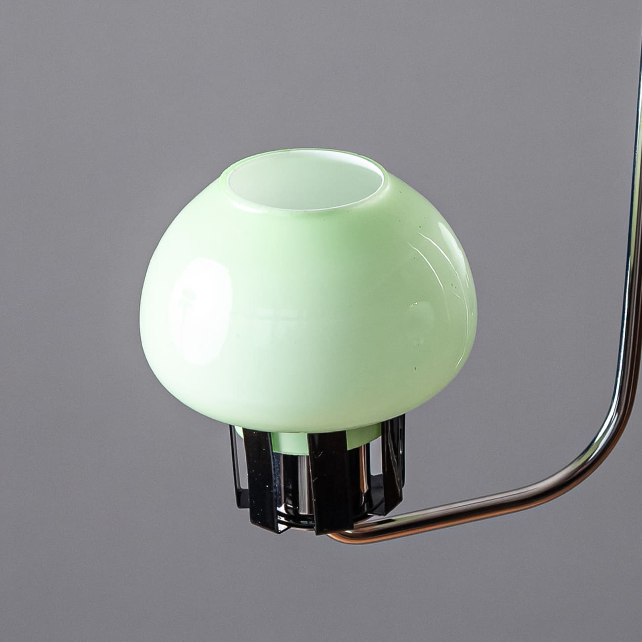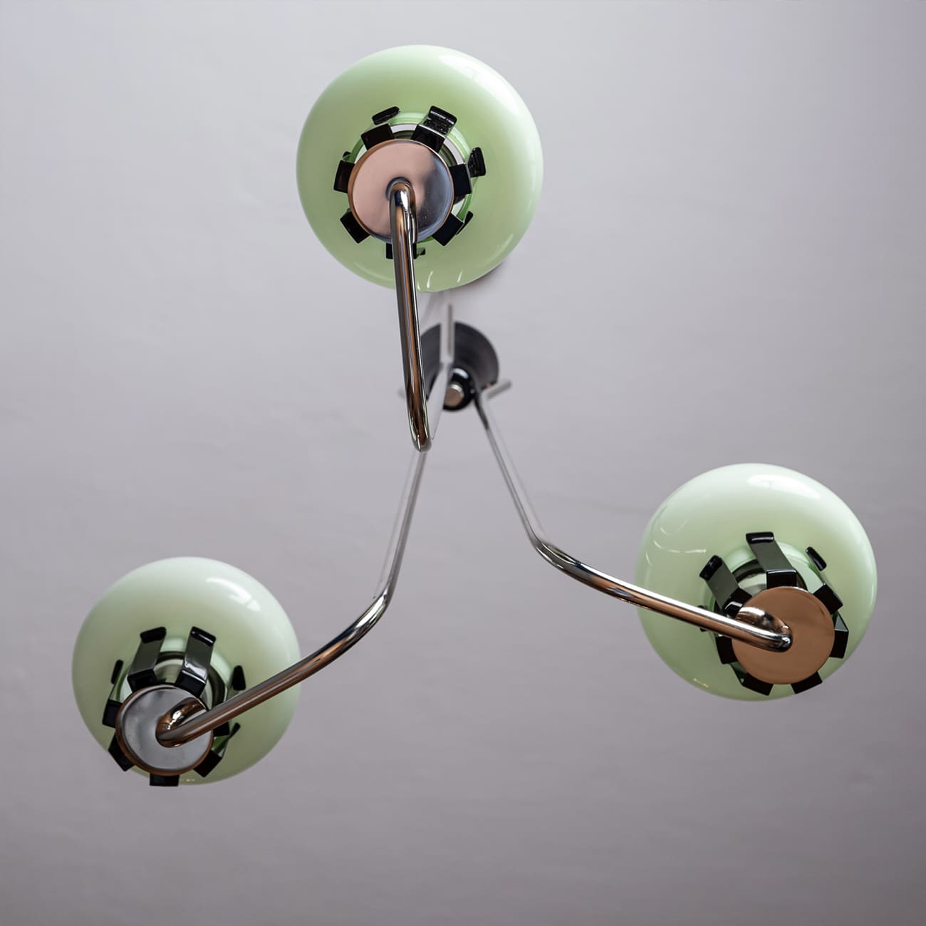 Zachowany egzemplarz ilustruje ostatnie dekady analogowej produkcji, w której precyzja wykonania i trwałość materiałowa stanowiły wartość nadrzędną. Trójramienna konstrukcja, oparta na elegancko prowadzonych stalowych profilach, została zaprojektowana z myślą o równomiernym rozprowadzeniu światła, a ręcznie formowane klosze ze szkła warstwowego w odcieniu subtelnej zieleni tworzą rozpoznawalny, wyjątkowy efekt świetlny.