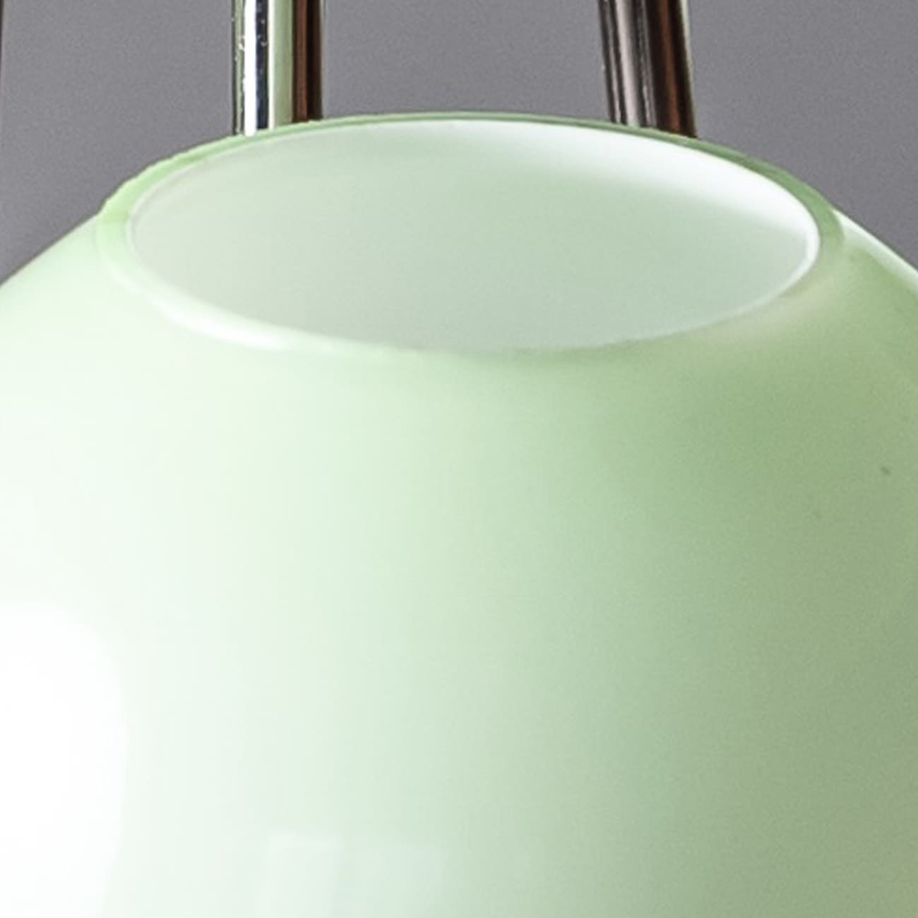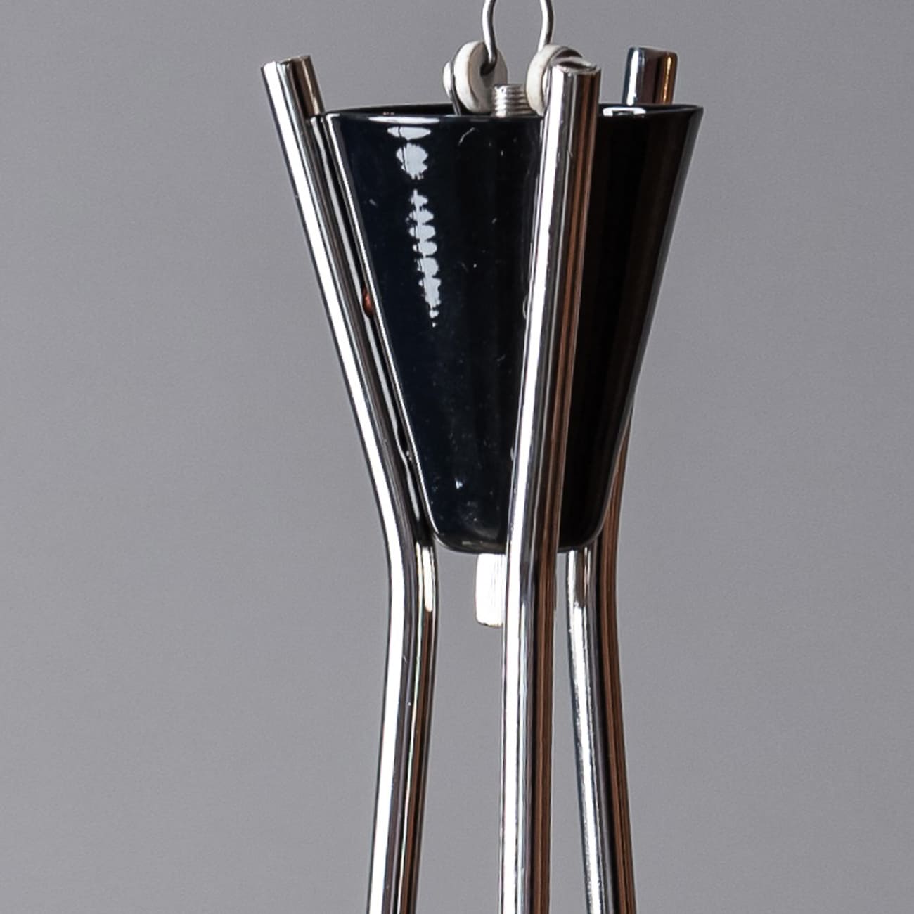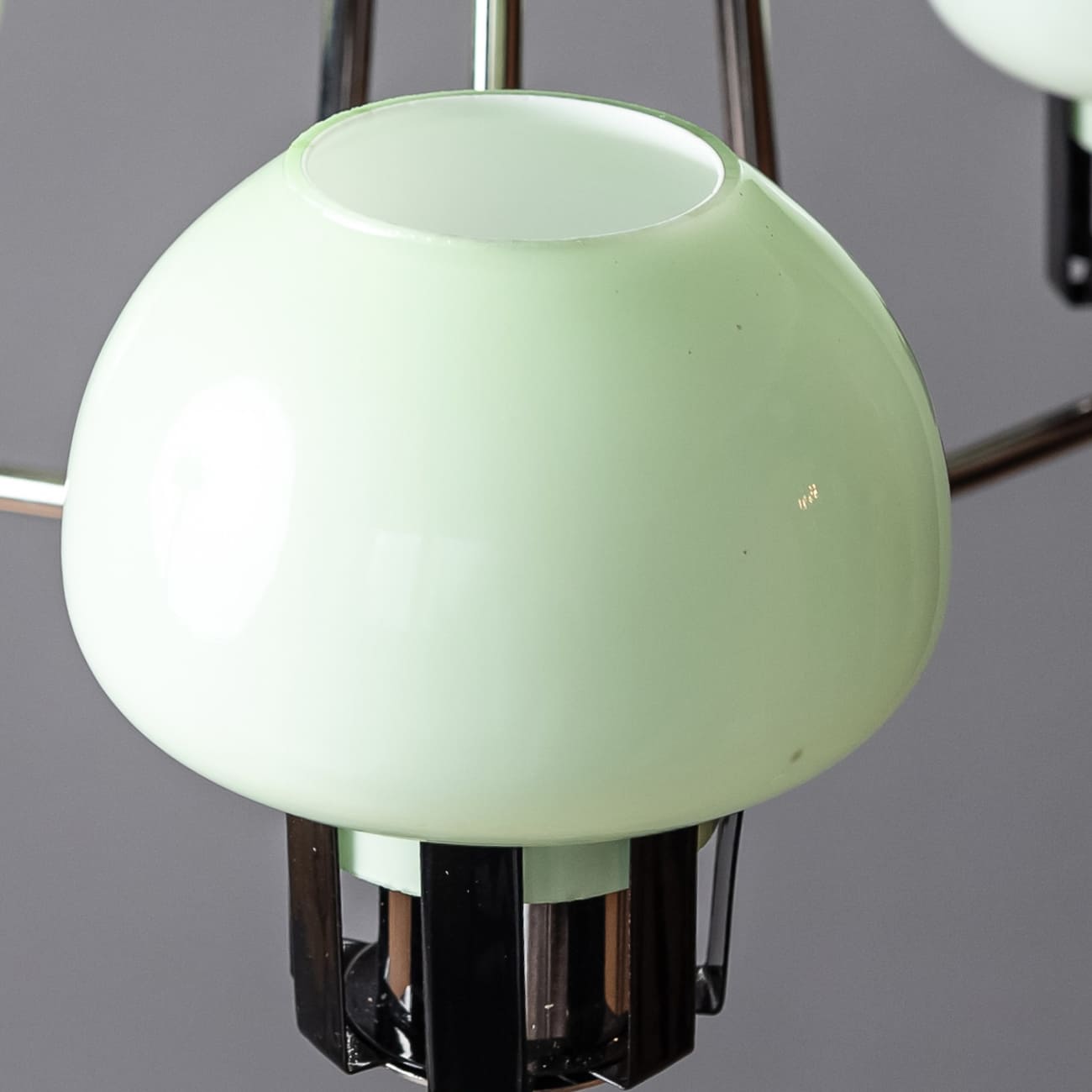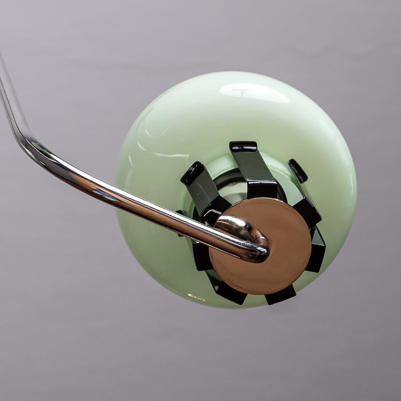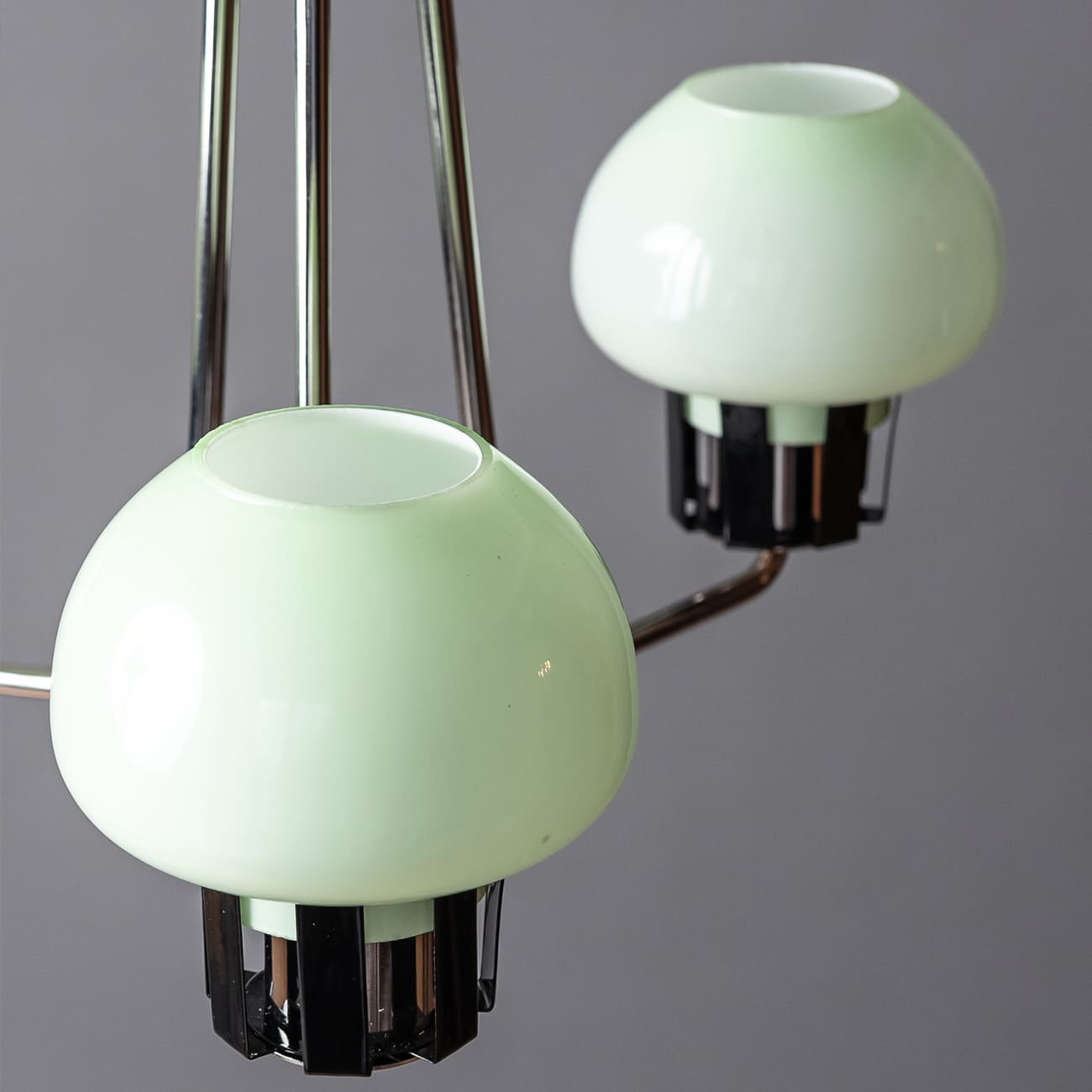 Zachowany egzemplarz ilustruje ostatnie dekady analogowej produkcji, w której precyzja wykonania i trwałość materiałowa stanowiły wartość nadrzędną. Trójramienna konstrukcja, oparta na elegancko prowadzonych stalowych profilach, została zaprojektowana z myślą o równomiernym rozprowadzeniu światła, a ręcznie formowane klosze ze szkła warstwowego w odcieniu subtelnej zieleni tworzą rozpoznawalny, wyjątkowy efekt świetlny.