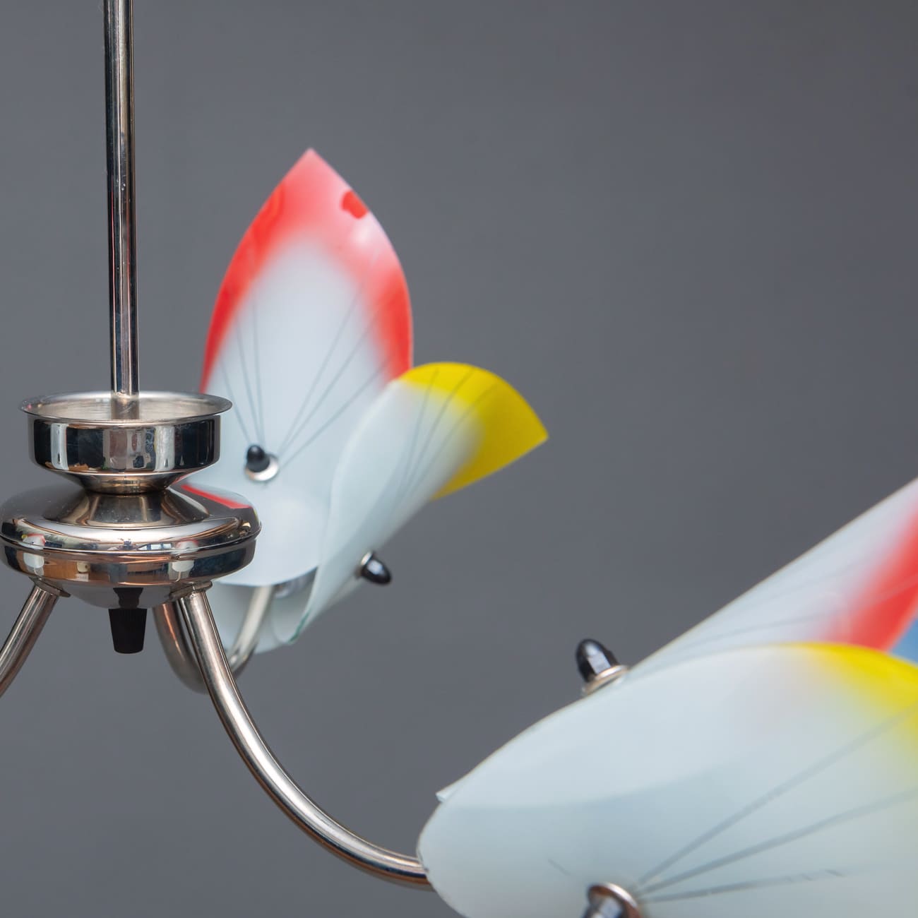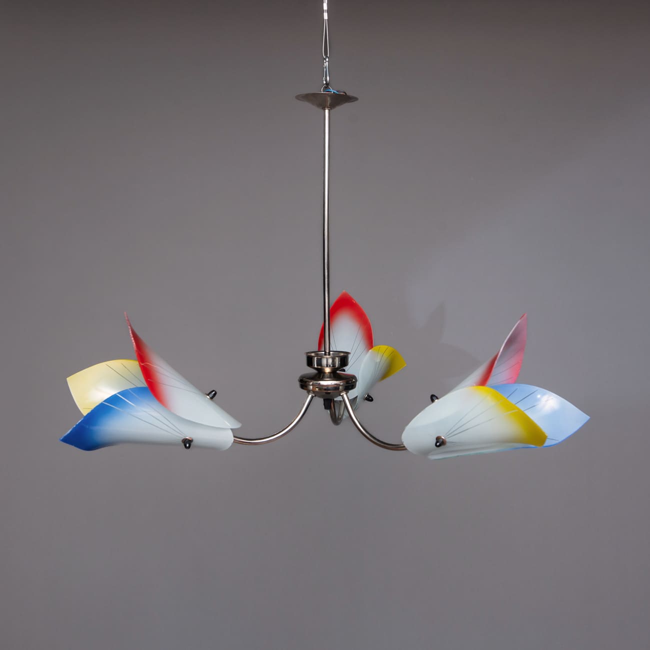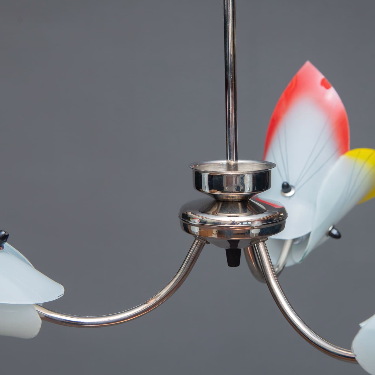 Żyrandol trójramienny z ręcznie malowanymi kloszami, Polska, lata 60.