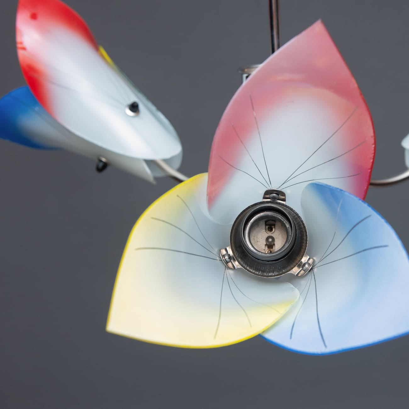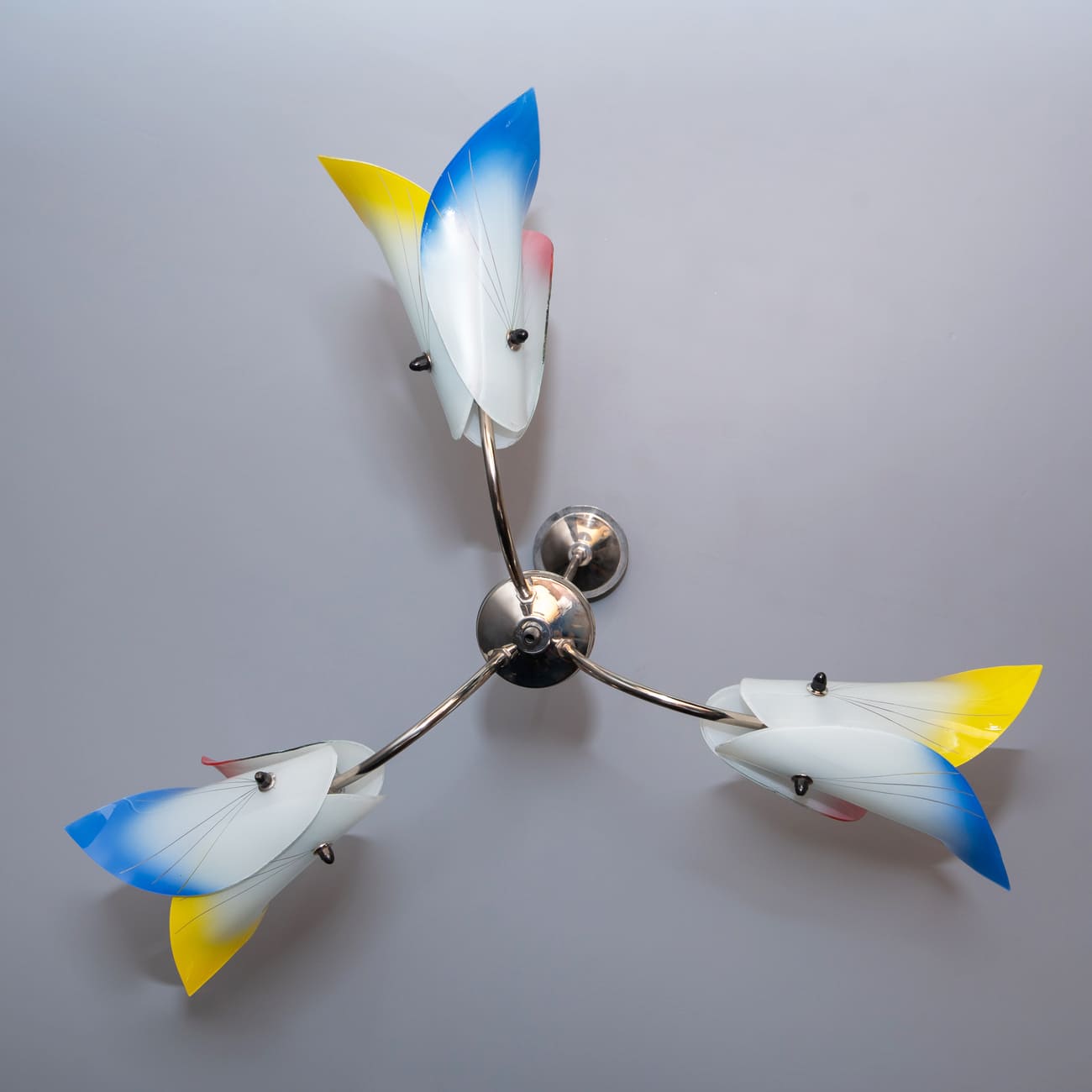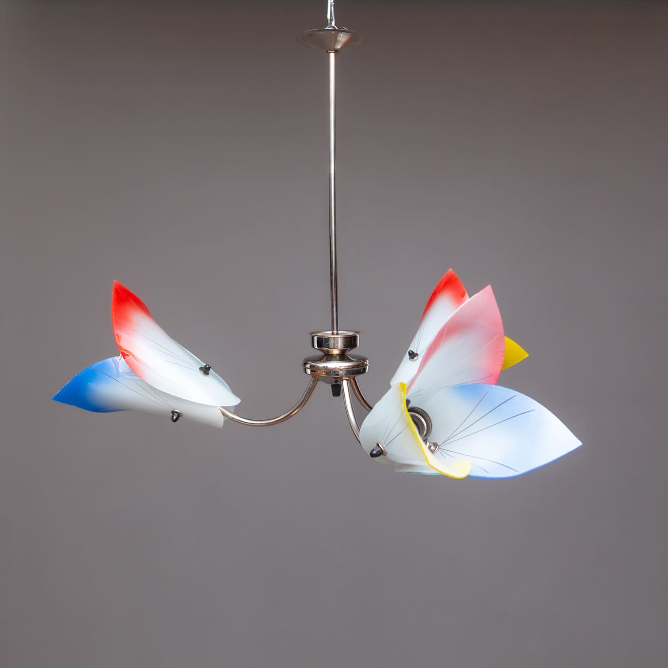 Żyrandol trójramienny z ręcznie malowanymi kloszami, Polska, lata 60.