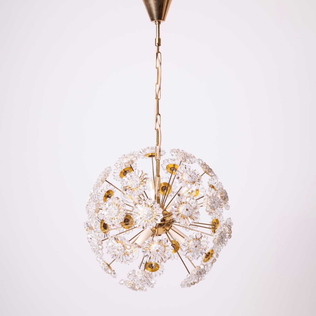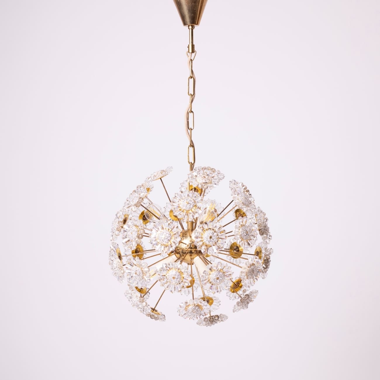 Żyrandol z lat 70., wykonany w renomowanej szkole hut szkła Kamenický Šenov w Czechosłowacji. Projekt wpisuje się w nurt Mid-Century i estetykę Space Age, łącząc elegancję kryształowego szkła z solidną konstrukcją z mosiądzu.