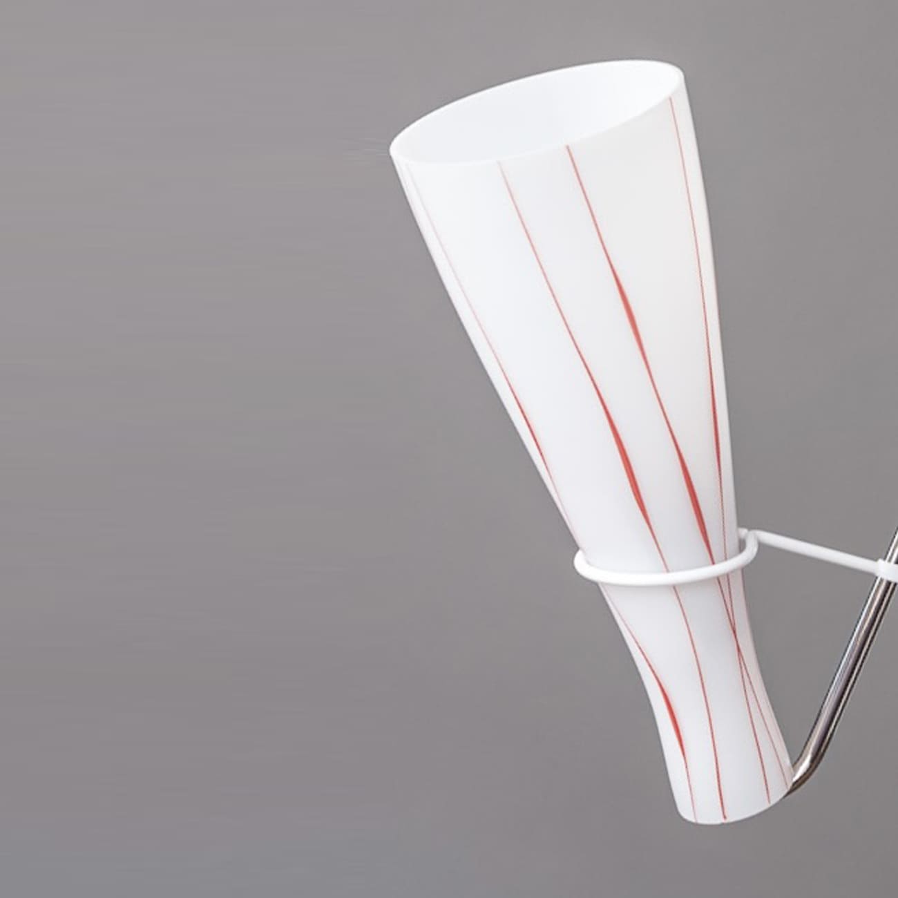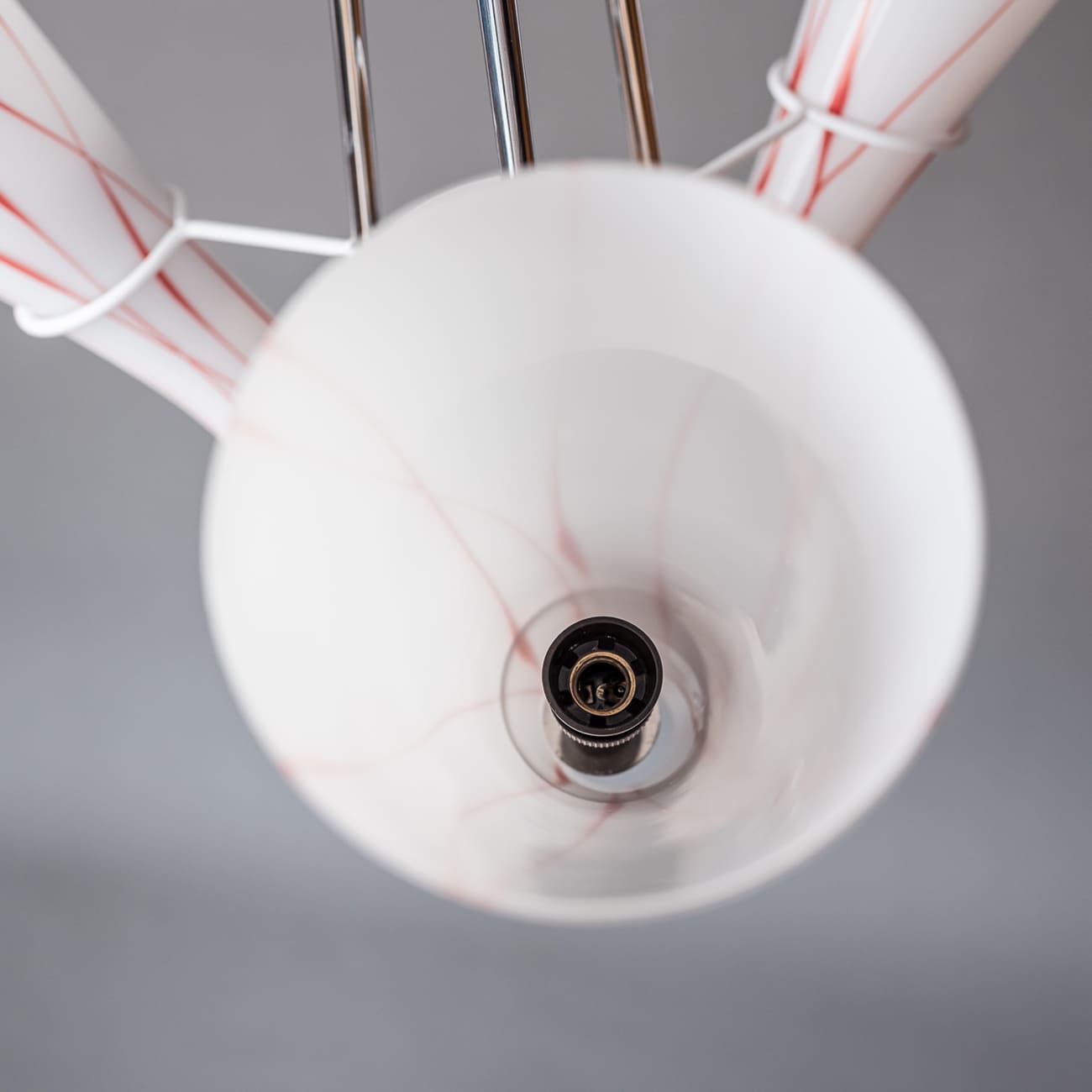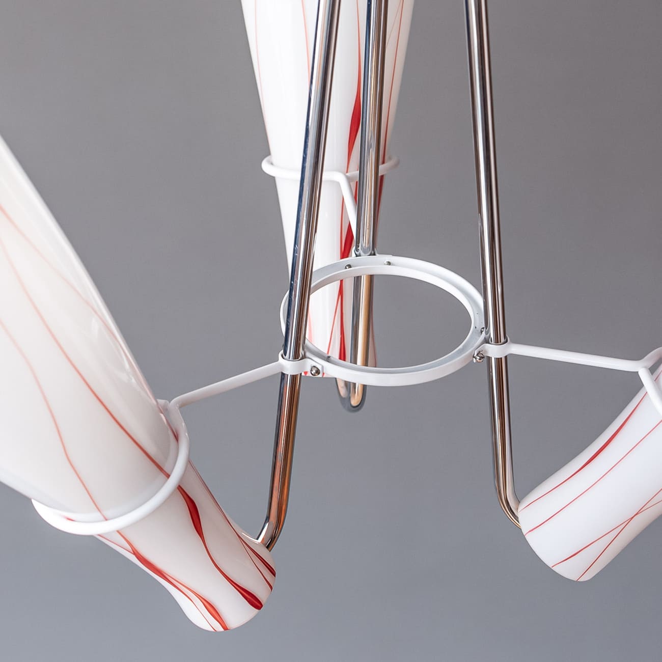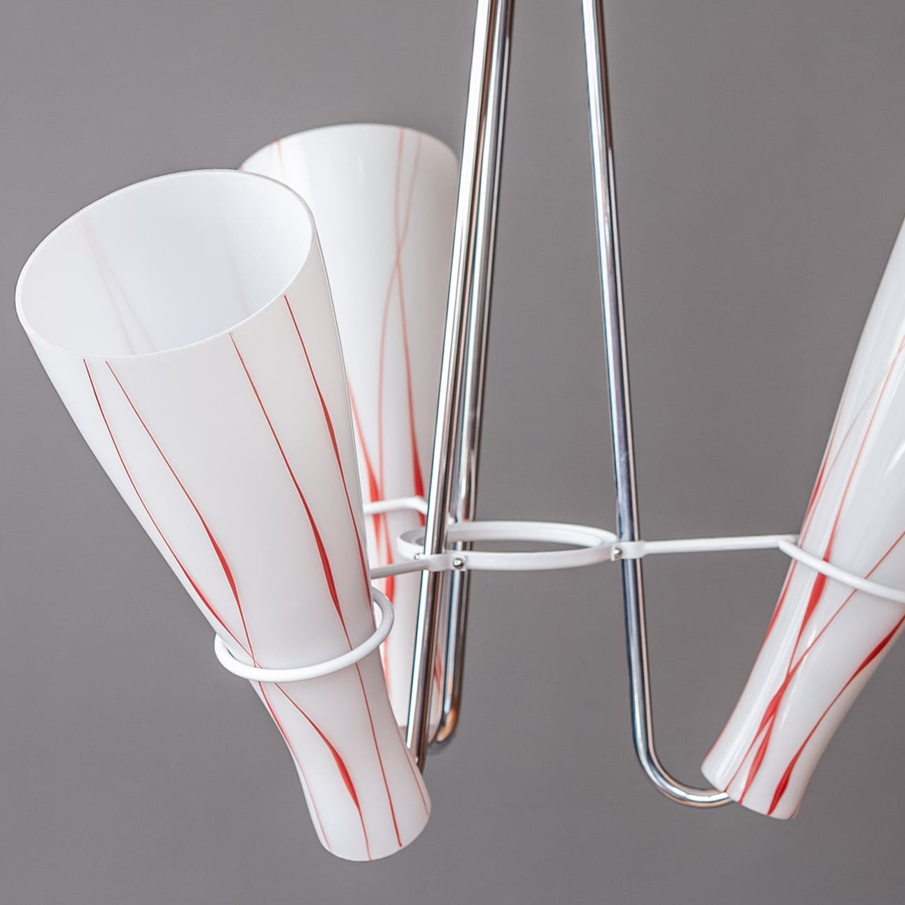 Klosze wykonane z białego szkła warstwowego mają smukłą, stożkową formę podkreśloną cienkimi, czerwonymi liniami, prowadzonymi swobodnym, rytmicznym ruchem pędzla. Ten typ ornamentu, charakterystyczny dla warsztatów Napako, nie był powtarzalnym nadrukiem, lecz rezultatem pracy rzemieślnika, którego ręka pozostawiała subtelne różnice układu barw. Autentyczność tych niuansów popwoduje, że dziś modele serii Zukov funkcjonują w obiegu kolekcjonerskim jako rzadkie relikty zanikłej tradycji hutnictwa oświetleniowego.